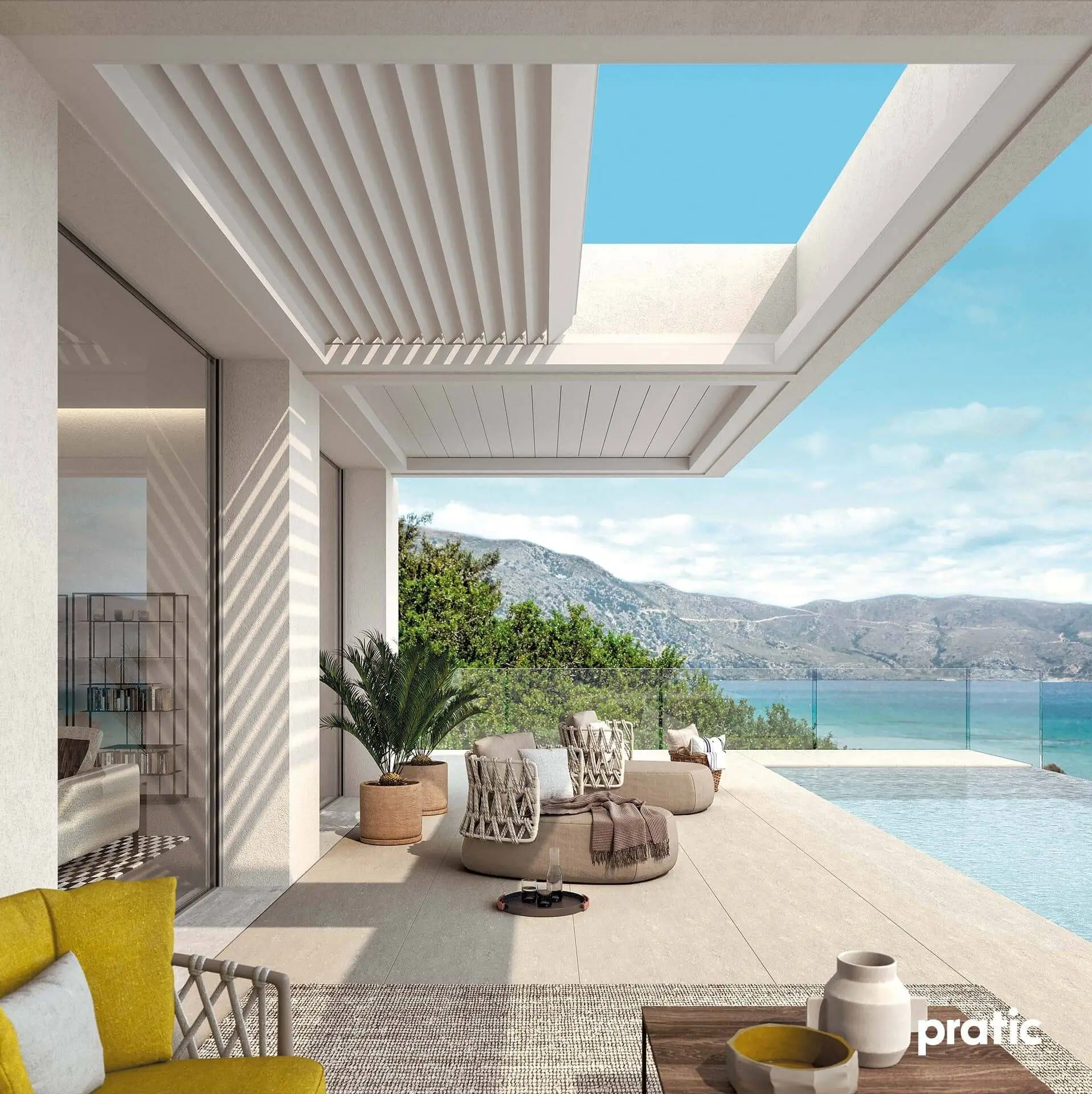 Mit Ihrer Schlichtheit kann diese Aluminium Pergola in bestehende Vorhaben integriert werden.